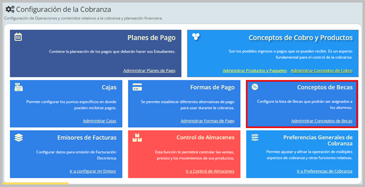 En en el menú de configuración de la cobranza, se encuentra la opción Administración Conceptos de Becas sección.