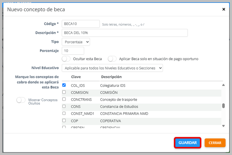 Seleccionamos uno o más conceptos de cobro donde aplicará el descuento de la Beca. Mismos que fueron creados con antelación en conceptos de cobro. |