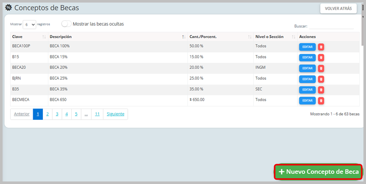 Para agregar una beca se debe hacer clic en "+ Nuevo Concepto de Beca".