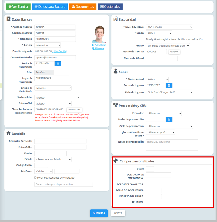 El campo estará disponible en la ficha de registro del alumno, familia, docente o empleado.