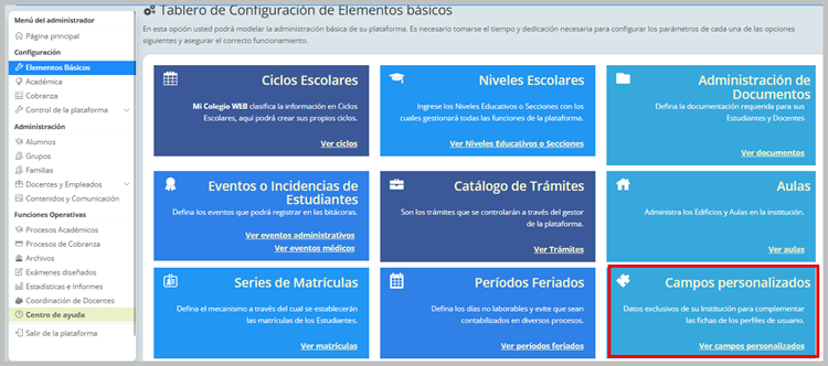 En el Menú del Administrador en el submenú de Configuración entramos a Elementos Básicos, ubicando el módulo de Campos