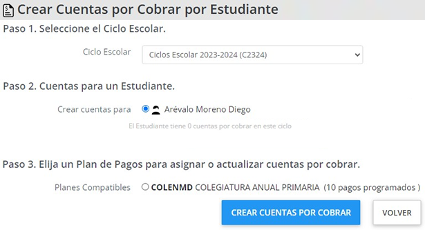 Seleccione el Ciclo Escolar, el alumno se mostrará de manera automática, elije el Plan de Pagos correspondiente.