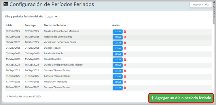 Para registrar un día feriado, haga "clic" en "+ Agregar un día o período feriado".