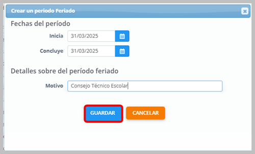 Debido a que, por ciclo escolar, existen días o períodos no laborables, es necesario registrar estas fechas o rangos de fechas inhábiles en la plataforma de Mi Colegio Web . Esto garantiza que, tanto en la bitácora de asistencias de los alumnos y para que otros proceso se realicen de manera adecuada.