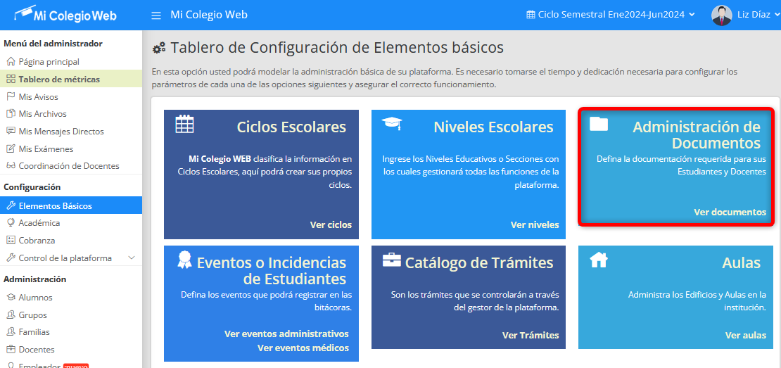 Para acceder a este módulo, ingrese al Menú del Administrador, seleccione el submenú Configuración y, posteriormente, diríjase a Elementos Básicos, donde encontrará la opción de Administración de Documentos.