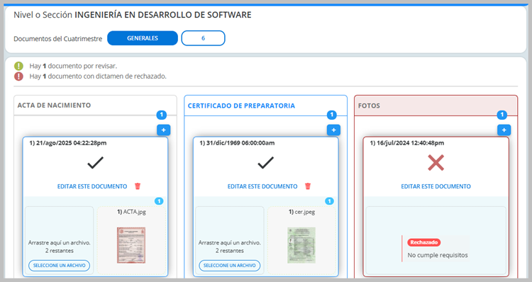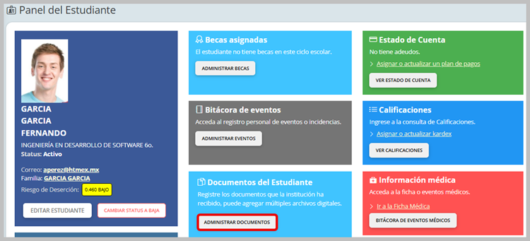 En la sesión del panel de Estudiante está disponible la administración de documentos de cada estudiante.