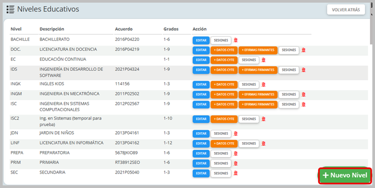 Cada nivel funciona de manera independiente y requiere registrar sus datos particulares. Si se gestionan carreras universitarias o programas similares, cada uno debe configurarse como un nivel separado.