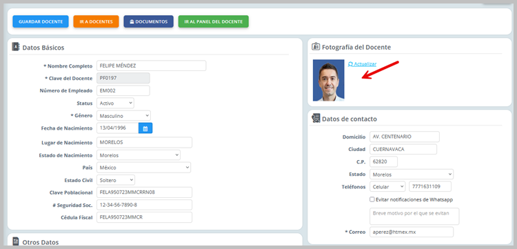 Se mostrará el formulario es importante capturar cada uno de los campos para obtener un perfil completo del Docente.