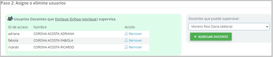 Esta sección de coordinación de Docentes le permite al administrador asignar a los usuarios los docentes que pueden supervisar desde la plataforma. En el menú de Administración de Usuarios está disponible la opción Administrar Cordinadores.