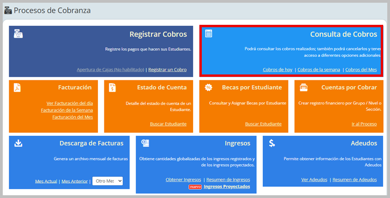 Desde la sección de consulta de cobros está disponibles las opciones de: Cobros de hoy, cobros de la semana y combros del mes.