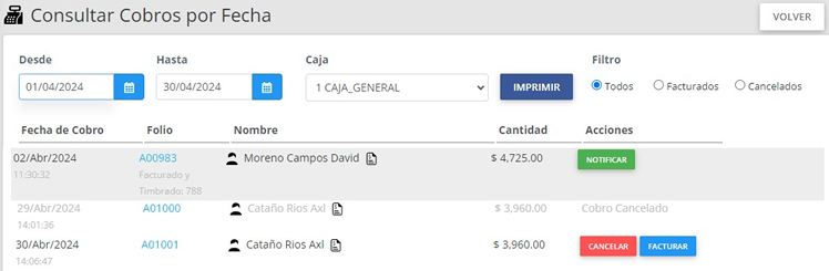 Se observa el detalle de los cobros realizados. Si selecciona el número de folio visualizará los elementos que incluyen el cobro.En la columna Acciones tiene disponible los siguientes botones:Notificar: Si el cobro fue facturado puede enviar nuevamente el E-mail de notificación.Cancelar: El cobro realizado. Facturar: Emitir la factura si no fue generada después del registro de cobro.