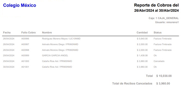 Ejemplo de reporte con detalle de cobros por periodo de una semana: