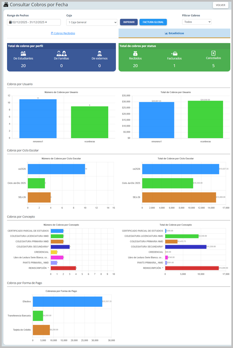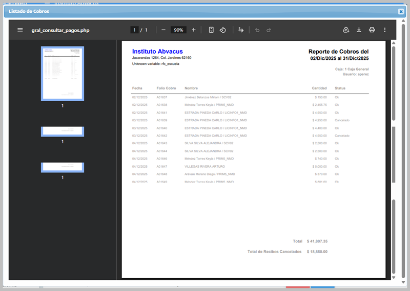 Se observa el listado de cobros recibidos: