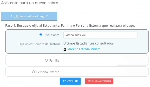 Se puede realizar el registro por Estudiante, Familias o persona Externa al seleccionar Registrar un Nuevo Cobro. Utilice el buscador y haga la selección pertinente para continuar.