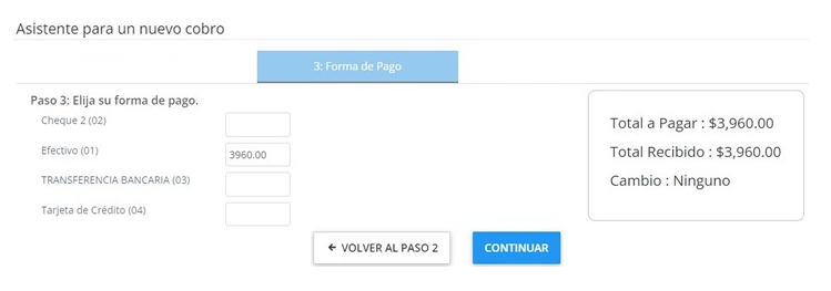 Continua con registro Forma de Pago, puedes elegir más de una, si el concepto de cobro cuenta con cantidad de Beca, descuentos, recargos o es un abono, el sistema realiza el cálculo del total a pagar de manera automática.
