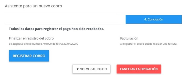 Para concluir haz click en Registrar Cobro, el sistema te indicará la fecha y folio de recibo que corresponda, y si cuentas con el módulo de facturación podrás emitir la Factura después del Cobro realizado.